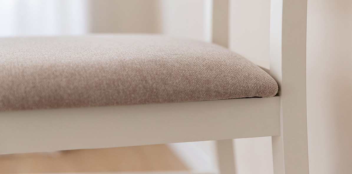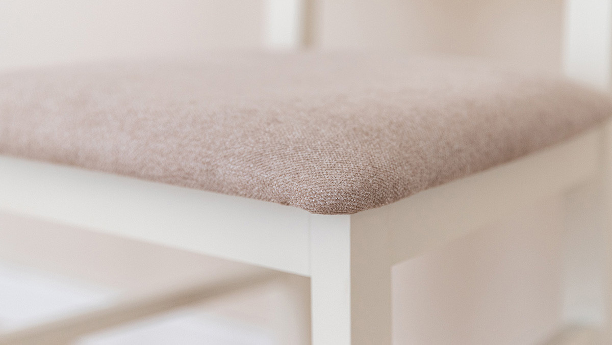 Vízbázisú meleg fehér színű festés, ami egyedi jelleget kölcsönöz. A szék két réteg fehér festékkel van fedve, 85%-os fedőképességgel. Ennek köszönhetően a fa szerkezete látható. Ezenkívül a fa viasszal van bevonva, amely csodálatos, természetes felületet ad. Az ökológiai vízbázisú festés lehetővé teszi, hogy a fa szabadon lélegezzen és öregedjen. Mindezt annak érdekében, hogy olyan terméket adjunk, amely nem károsítja a környezetet.