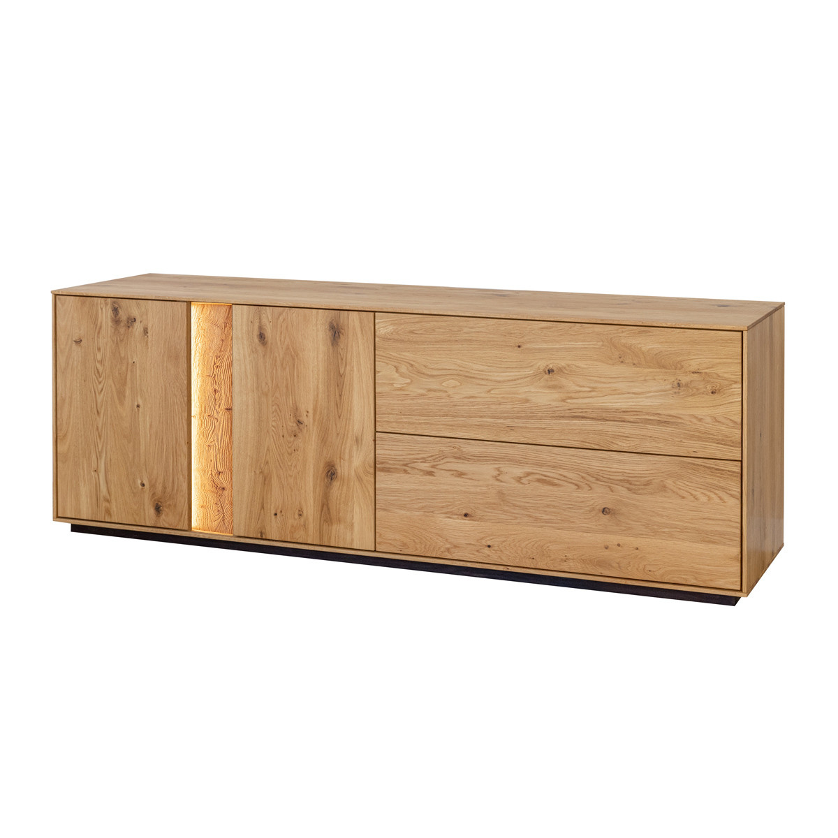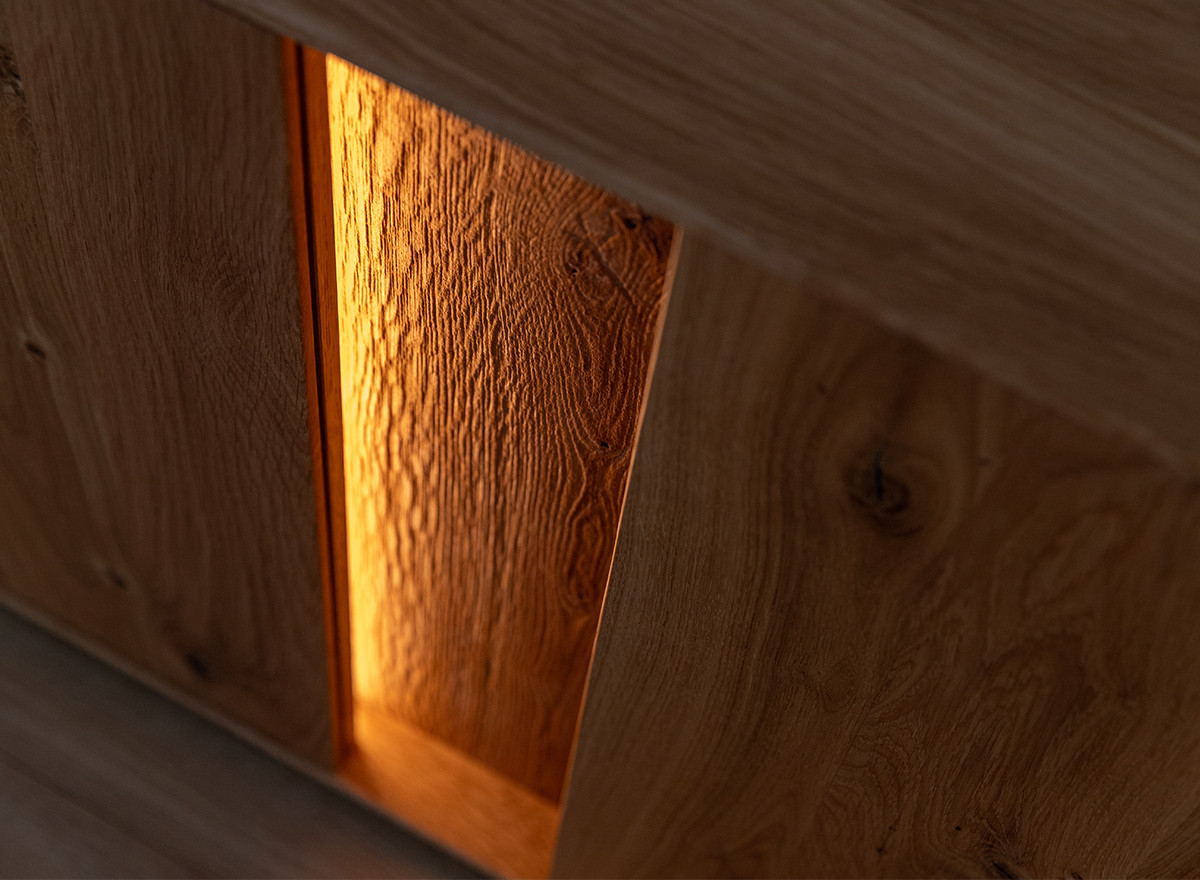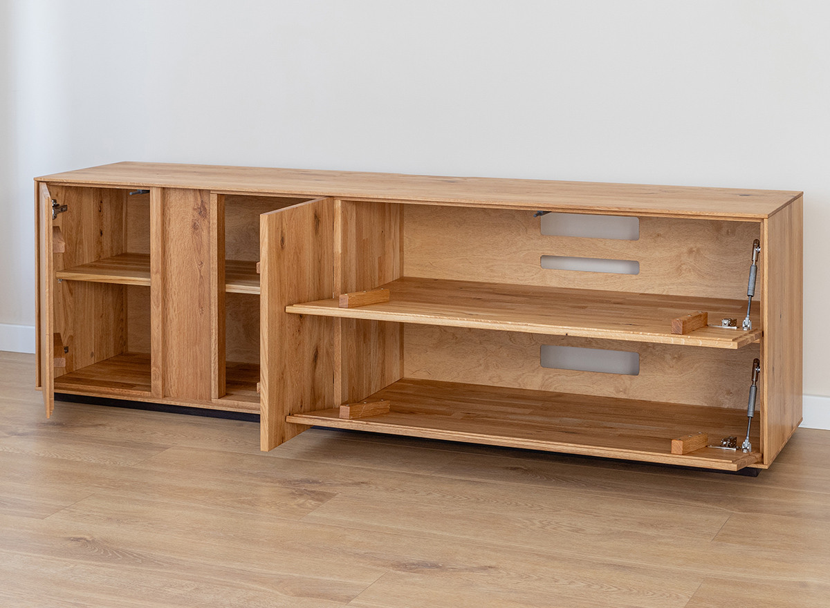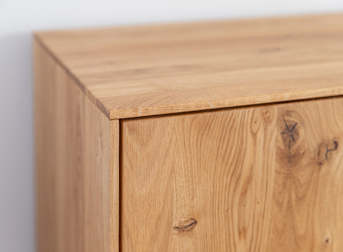 Hagyomány és a modernitás kifinomult kombinációja. A dekoratív világítás hozzáadásának lehetősége tovább hangsúlyozza egyediségét. Ideális megoldás az elegáns, skandináv, modern vagy klasszikus stílus szerelmeseinek. A bútor ajtók melletti része természetes csiszolatlan tölgyfából készül, még jobban fokozva a természetességet. A ledes világítással igazán erőteljes hangsúlyt kap a fa.  A két baloldali ajtó klasszikus oldalra nyíló, míg a két jobb oldali ajtó lefele nyílik, gázrugó segítséggel. A TV komód minden része valódi tölgyfa, egyedül a bútor hátulja készül rétegelt fa lemezből. A lehajtható ajtós rész hátulja kivágásokkal ellátott, hogy a média elemek vezetékei bejuthassanak. A komód rengeteg tárolóhelyet biztosít, védve a tárgyakat a portól és a fénytől, A bútor élei nagyon finoman ívelek, a lábazat sötét színűre pácolt, elemelve a bútort a padlózattól.