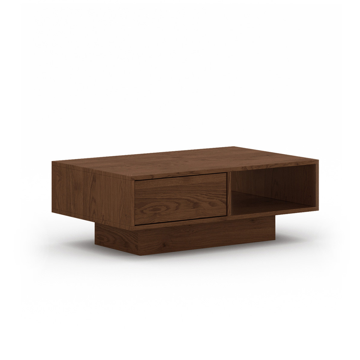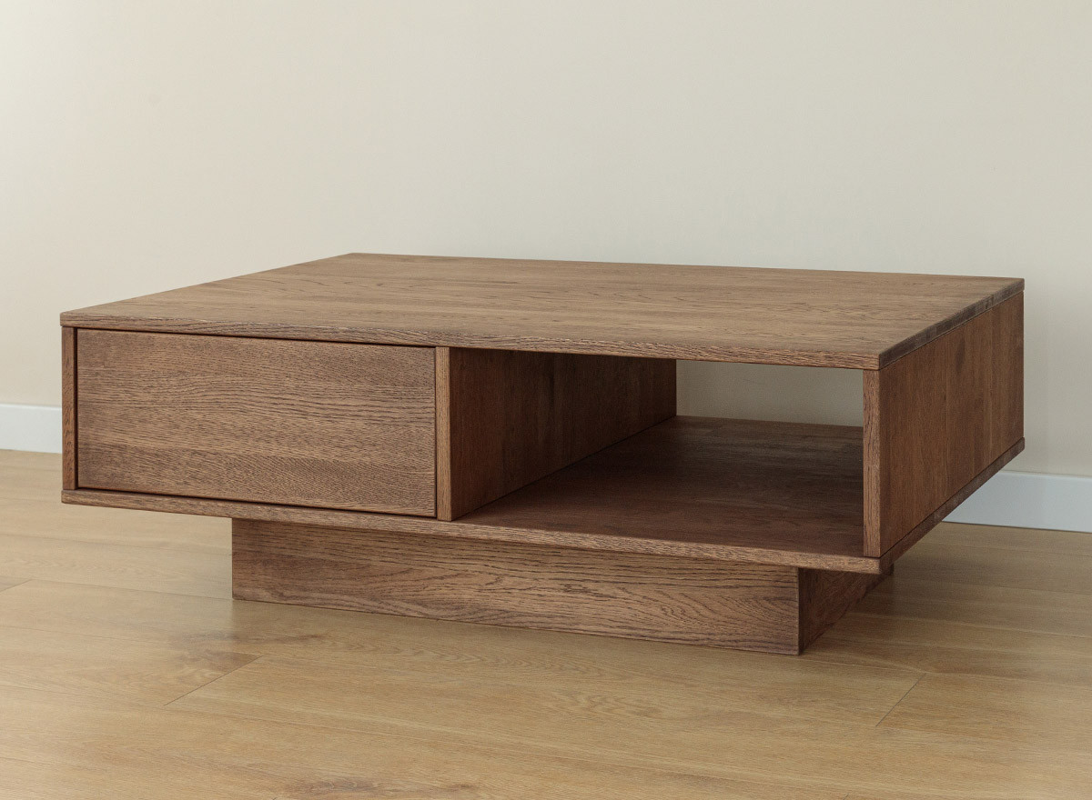 Minimalista stílusú dohányzóasztal funkcionalitása kétségtelenül az erős oldala. A tetőlap tökéletes a mindennapi használatra, míg az alsó polc és nyitott rész további tárhelyet biztosít. A tetőlap alatt finoman elrejtett fiók tökéletes az apró tárgyak vagy kiegészítők elrejtésére, amelyeket kéznél szeretnénk tartani, ugyanakkor elrejteni a vendégek szeme elől. Mindez tökéletes megoldássá teszi a dohányzóasztalt azok számára, akik értékelik az esztétika és a praktikum kombinációját. Az asztal másik jellegzetessége a lábszerkezet, megfelelő magasságba emelve a bútort és ezen kívül stabilitást is ad.
