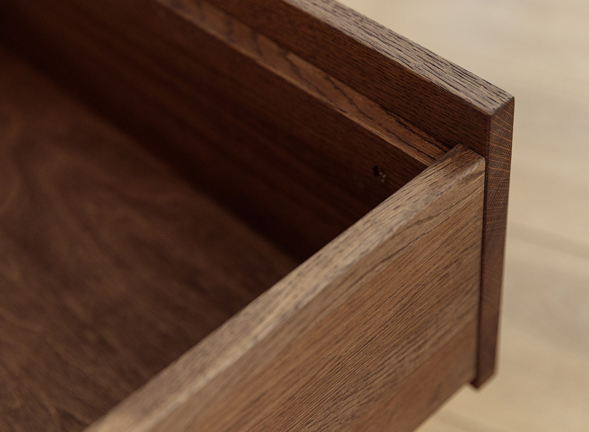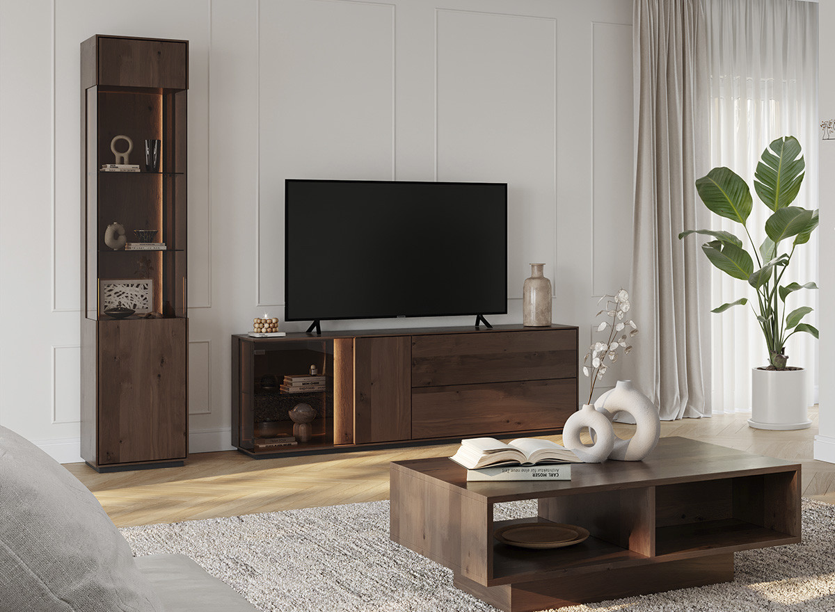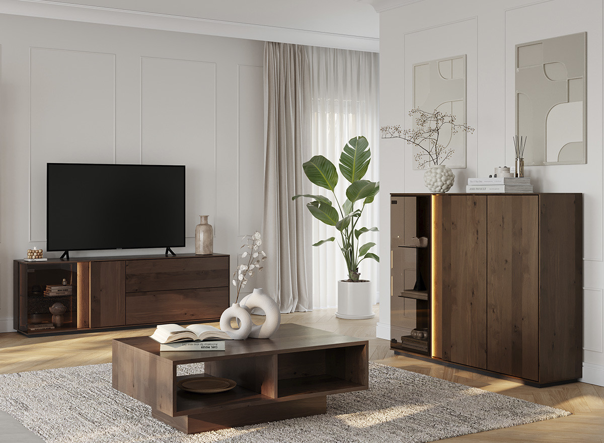 A bútorcsalád nappali bútorai teljes egészében valódi tölgyfából készülnek, felületkezelése a dohányszínű olajozás nem egy hagyományos szín. Ez a technika nem csupán színezi a fát, hanem kiemeli annak természetes erezetét, miközben védelmet is nyújt. A sötét tónus, mint ez a dohány szín azonnal prémium megjelenést kölcsönöz a helyiségnek. A tölgy markáns rajzolata a sötétebb olaj hatására „életre kel”, ami vizuális textúrát ad a bútornak. Tudtad, hogy a sötét bútorok optikailag „nehezebbnek” tűnnek? Kisebb helyiségekben érdemes csak egy-egy sötétebb bútort elhelyezni, hogy ne nyomja össze a teret, míg tágas, világos szobákban a sötét bútorok segítik a meghittség kialakítását.