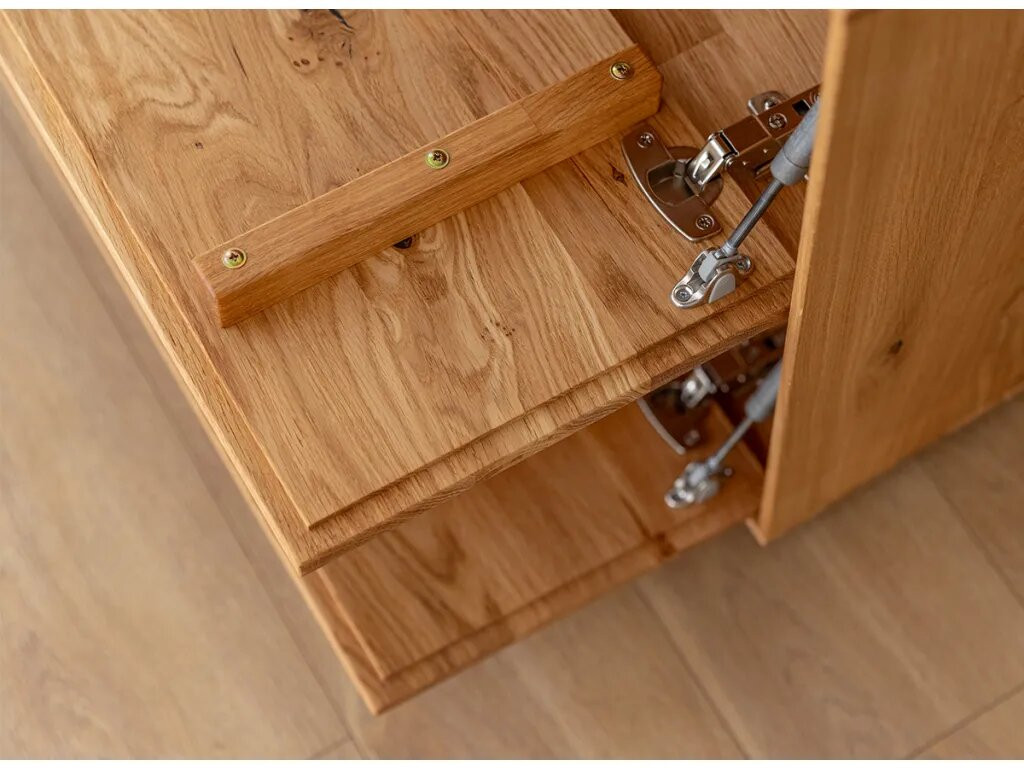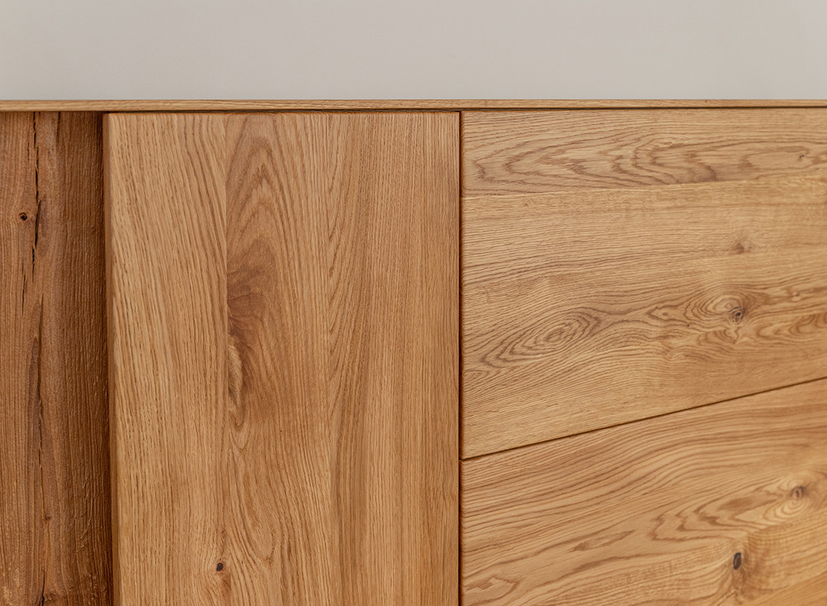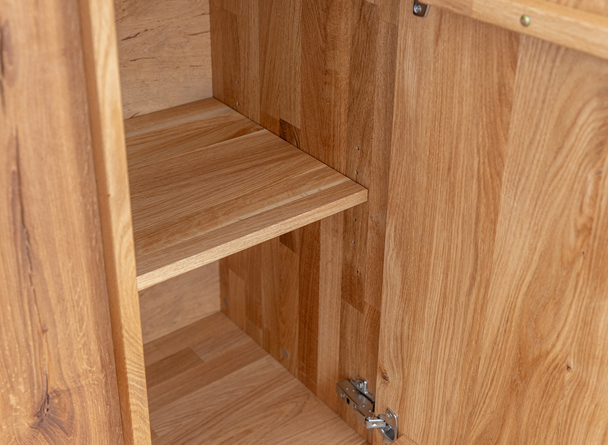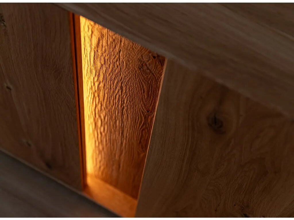 Hagyomány és a modernitás kifinomult kombinációja. A dekoratív világítás hozzáadásának lehetősége tovább hangsúlyozza egyediségét. Ideális megoldás az elegáns, skandináv, modern vagy klasszikus stílus szerelmeseinek. A bútor ajtók melletti része természetes csiszolatlan tölgyfából készül, még jobban fokozva a természetességet. A ledes világítással igazán erőteljes hangsúlyt kap a fa. A két baloldali ajtó klasszikus oldalra nyíló, míg a két jobb oldali ajtó lefele nyílik, gázrugó segítséggel. A komód minden része valódi tölgyfa, egyedül a bútor hátulja készül rétegelt fa lemezből. A komód rengeteg tárolóhelyet biztosít, védve a tárgyakat a portól és a fénytől, A bútor élei nagyon finoman ívelek, a lábazat sötét színűre pácolt, elemelve a bútort a padlózattól.