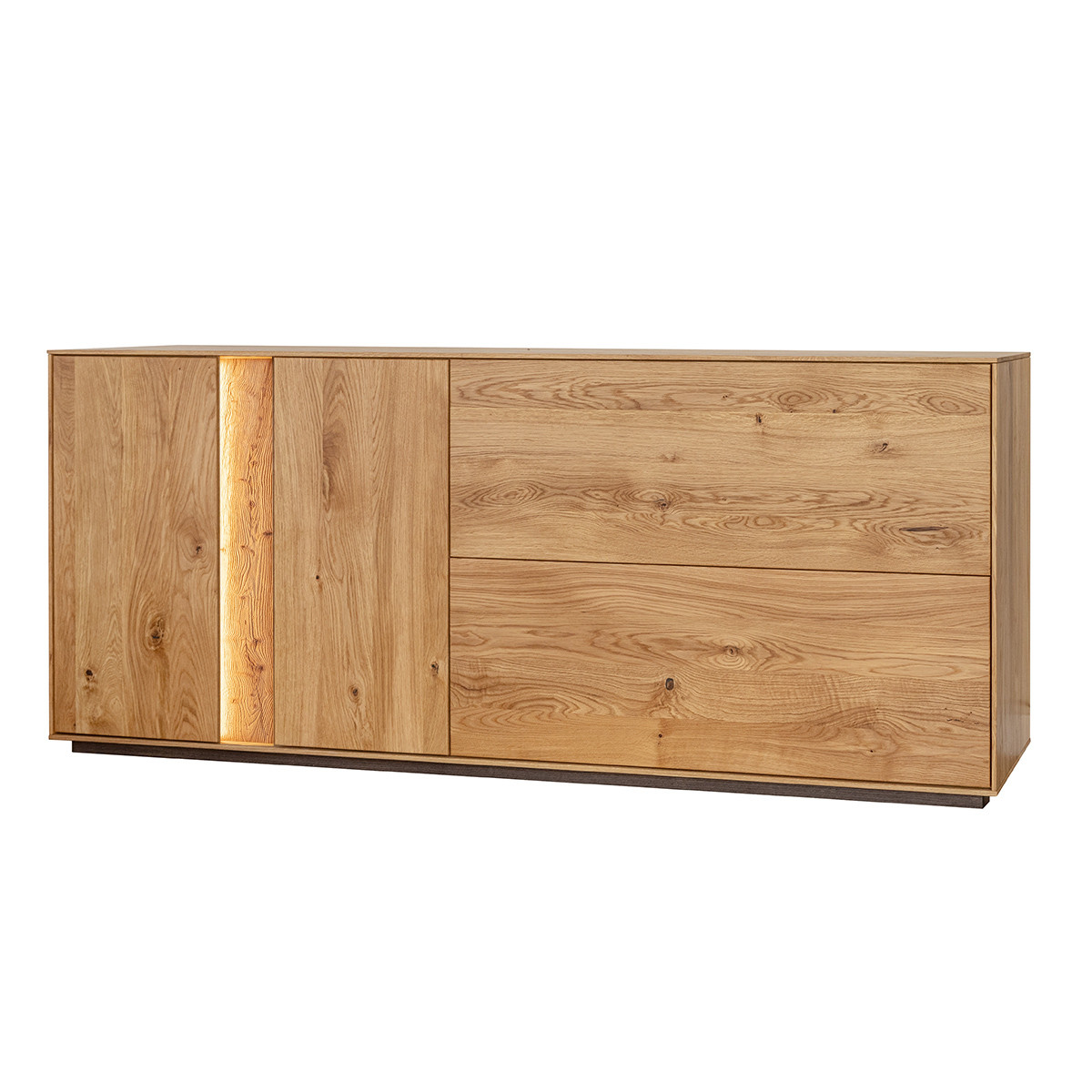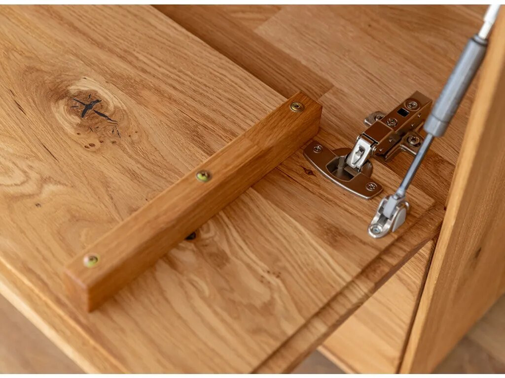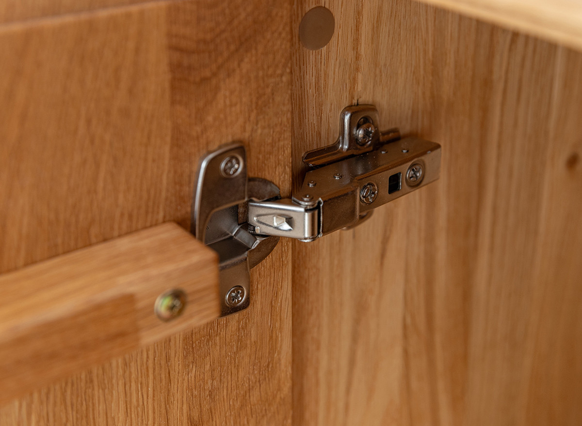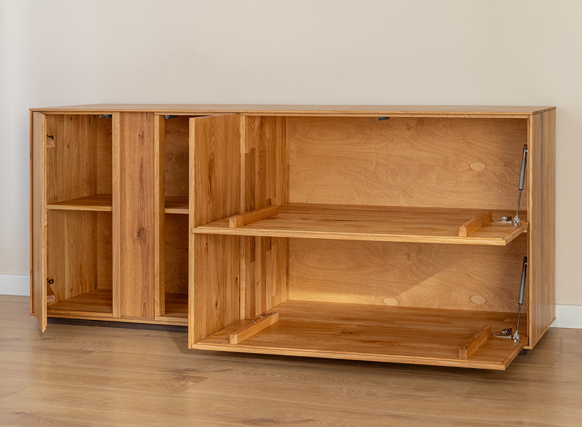 Hagyomány és a modernitás kifinomult kombinációja. A dekoratív világítás hozzáadásának lehetősége tovább hangsúlyozza egyediségét. Ideális megoldás az elegáns, skandináv, modern vagy klasszikus stílus szerelmeseinek. A bútor ajtók melletti része természetes csiszolatlan tölgyfából készül, még jobban fokozva a természetességet. A ledes világítással igazán erőteljes hangsúlyt kap a fa. A két baloldali ajtó klasszikus oldalra nyíló, míg a két jobb oldali ajtó lefele nyílik, gázrugó segítséggel. A komód minden része valódi tölgyfa, egyedül a bútor hátulja készül rétegelt fa lemezből. A komód rengeteg tárolóhelyet biztosít, védve a tárgyakat a portól és a fénytől, A bútor élei nagyon finoman ívelek, a lábazat sötét színűre pácolt, elemelve a bútort a padlózattól.