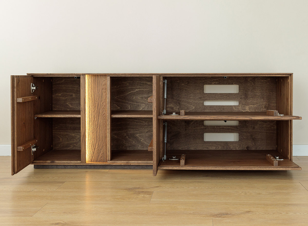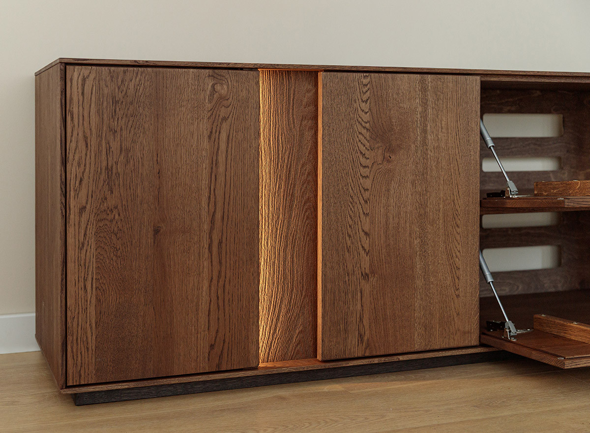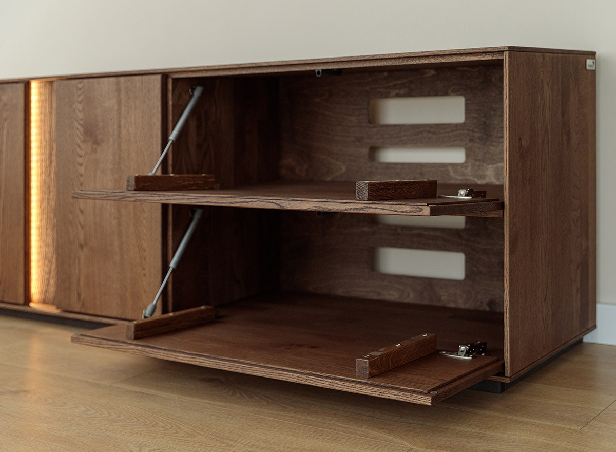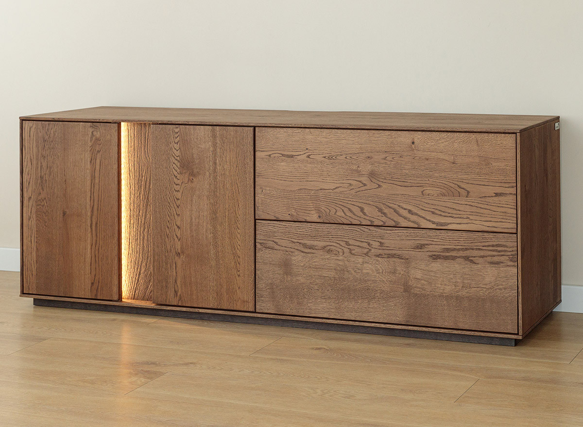 Hagyomány és a modernitás kifinomult kombinációja. A dekoratív világítás hozzáadásának lehetősége tovább hangsúlyozza egyediségét. Ideális megoldás az elegáns, skandináv, modern vagy klasszikus stílus szerelmeseinek. A teli előlappal ellátott ajtós rész rengeteg tárolóhelyet biztosít, védve a tárgyakat a portól és a fénytől, míg az üvegrész lehetővé teszi kedvenc dekorációi vagy kollekciói megjelenítését. A könnyen tisztítható üvegpolcok remekül mutatnak dekoratív világítással kombinálva, rendkívül lenyűgöző belső teret hozva létre a vitrines részben. A ledes világítással igazán erőteljes hangsúlyt kap a fa. A két baloldali ajtó klasszikus oldalra nyíló, míg a két jobb oldali ajtó lefele nyílik, gázrugó segítséggel. A média komód minden része valódi tölgyfa, egyedül a bútor hátulja készül rétegelt fa lemezből. A lehajtható ajtós rész hátulja kivágásokkal ellátott, hogy a média elemek vezetékei bejuthassanak. A komód rengeteg tárolóhelyet biztosít, védve a tárgyakat a portól és a fénytől, A bútor élei nagyon finoman ívelek, a lábazat sötét színűre pácolt, elemelve a bútort a padlózattól.