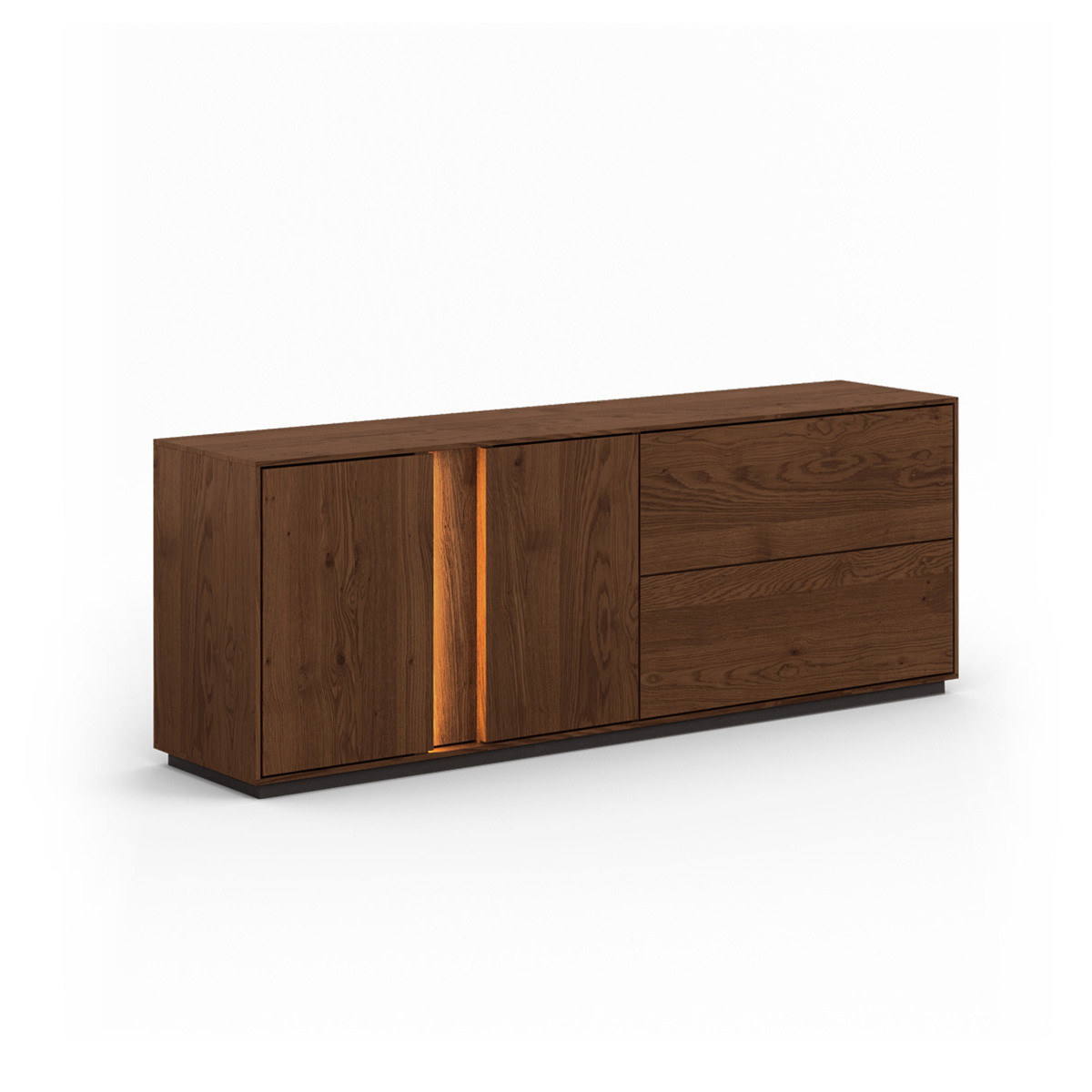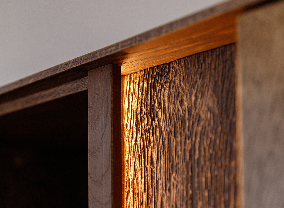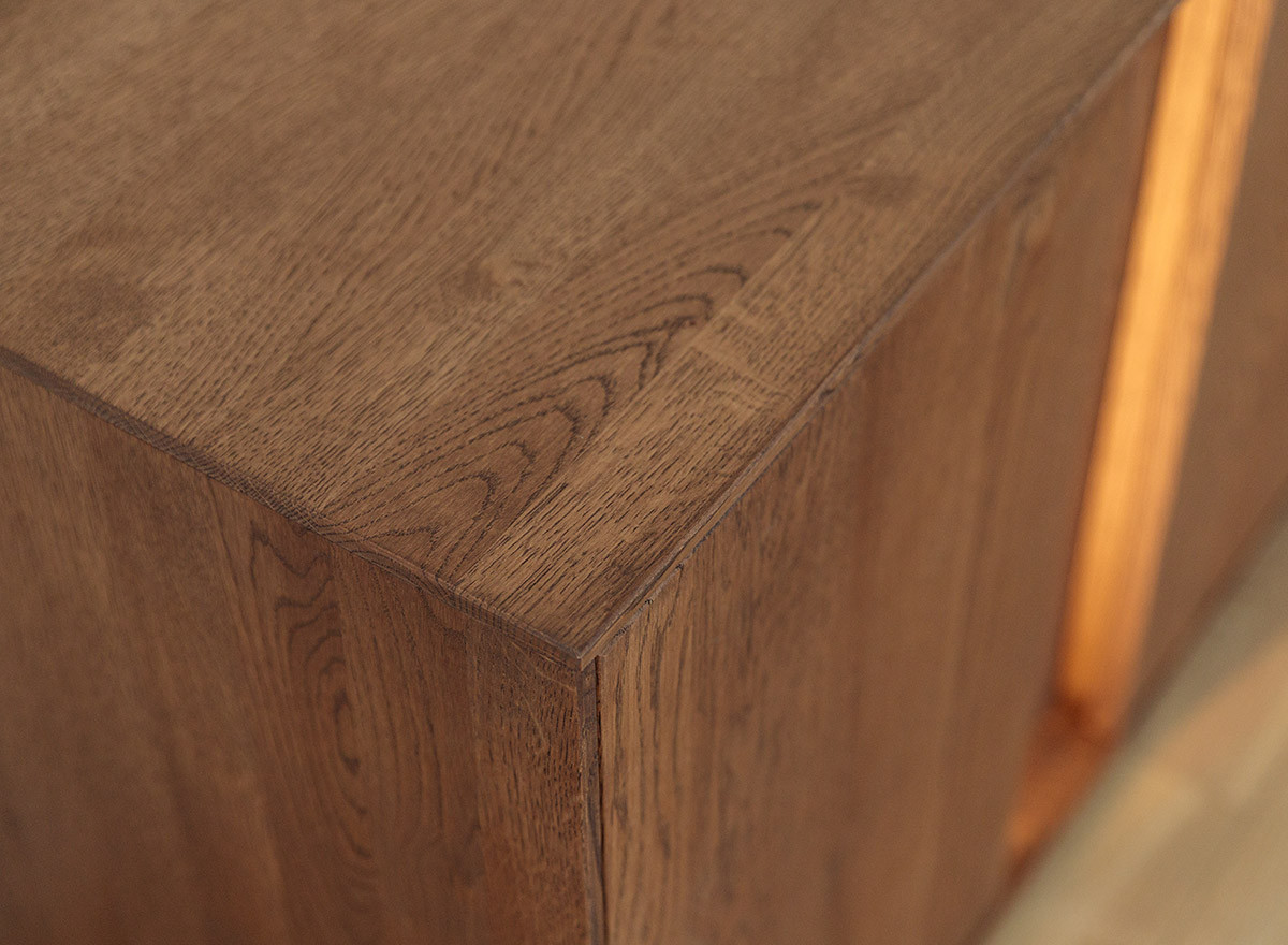 Hagyomány és a modernitás kifinomult kombinációja. A dekoratív világítás hozzáadásának lehetősége tovább hangsúlyozza egyediségét. Ideális megoldás az elegáns, skandináv, modern vagy klasszikus stílus szerelmeseinek. A teli előlappal ellátott ajtós rész rengeteg tárolóhelyet biztosít, védve a tárgyakat a portól és a fénytől, míg az üvegrész lehetővé teszi kedvenc dekorációi vagy kollekciói megjelenítését. A könnyen tisztítható üvegpolcok remekül mutatnak dekoratív világítással kombinálva, rendkívül lenyűgöző belső teret hozva létre a vitrines részben. A ledes világítással igazán erőteljes hangsúlyt kap a fa. A két baloldali ajtó klasszikus oldalra nyíló, míg a két jobb oldali ajtó lefele nyílik, gázrugó segítséggel. A média komód minden része valódi tölgyfa, egyedül a bútor hátulja készül rétegelt fa lemezből. A lehajtható ajtós rész hátulja kivágásokkal ellátott, hogy a média elemek vezetékei bejuthassanak. A komód rengeteg tárolóhelyet biztosít, védve a tárgyakat a portól és a fénytől, A bútor élei nagyon finoman ívelek, a lábazat sötét színűre pácolt, elemelve a bútort a padlózattól.