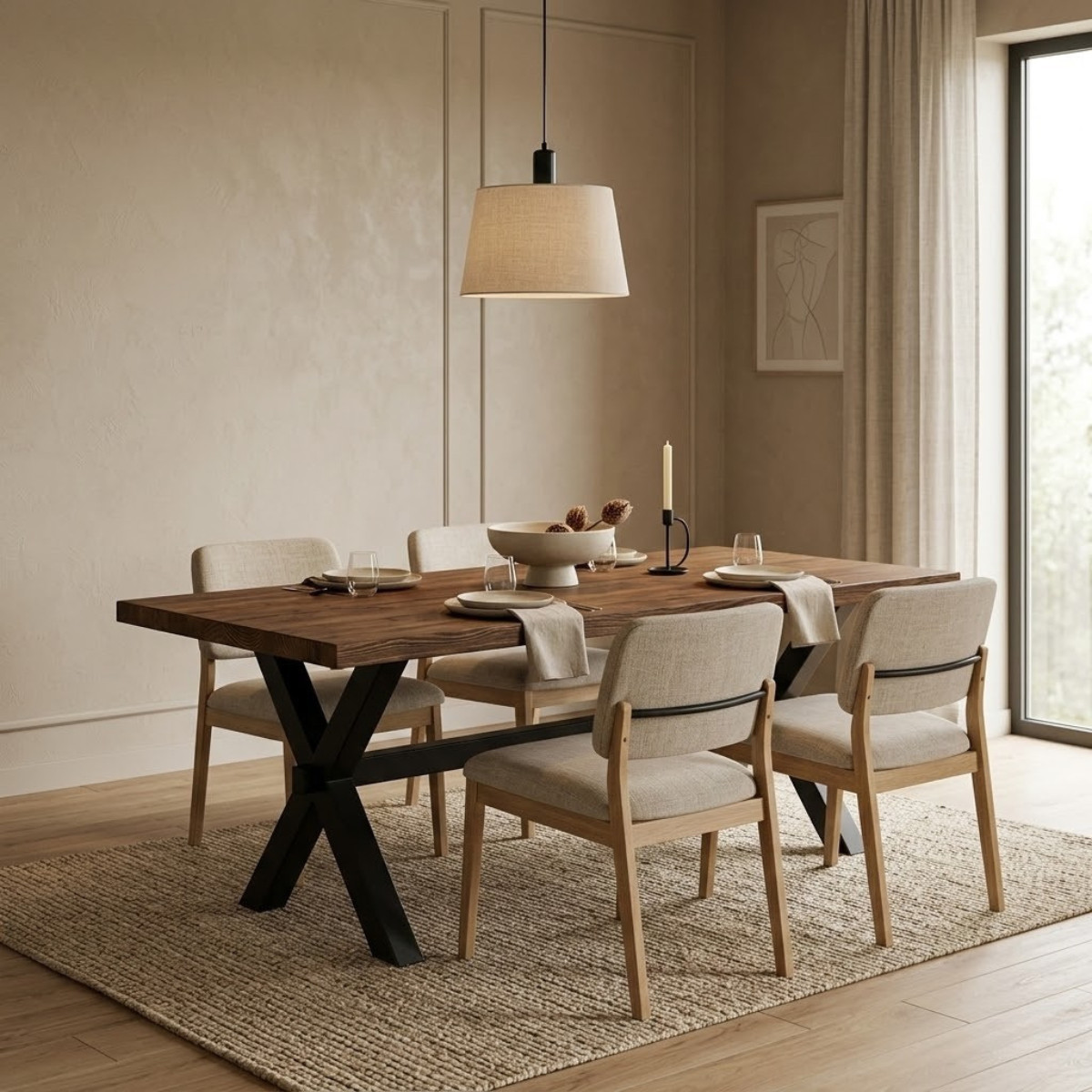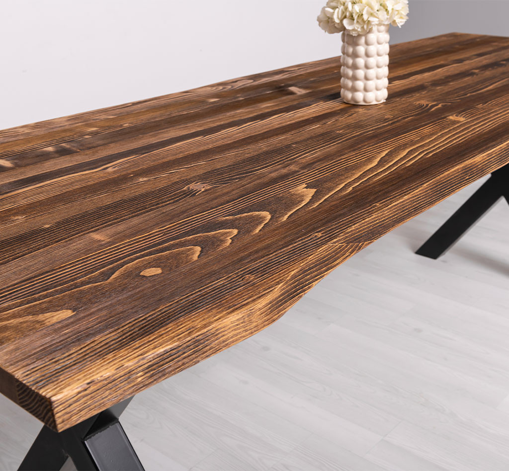 Fix 240 x 100 cm-es felülettel rendelkezik, nem bővíthető. Ennek a bútornak minden étkezőben és konyhában, de akár egy loft stílusban berendezett nappaliban is érdemes helyet találni. A szerkezet vizuálisan könnyű, így tágas és kis belső terekbe egyaránt tökéletes. A porszórt fémből készült lábakra van helyezve a 40 mm vastag valódi fenyő asztal lap, ezzel esztétikusan ötvözi a fa természetes, meleg színét az időtlen feketével. Az élvágás a hosszanti oldalon szabálytalan és fentről csapott, míg a rövidebb oldalon szabályos, egyenes. Ezzel a módszerrel még természetesebb benyomást kelt az asztal teteje. A tömörfa asztalok különösen népszerűek, mivel elegáns megjelenést és tartósságot kínálnak. Az étkezőasztal a családi és baráti összejövetelek központja. Az asztal körüli étkezések erősítik a családi kötelékeket és lehetőséget adnak a közös élmények megosztására, mindemellett baráti összejövetelek során teret ad a beszélgetéseknek és közös programoknak. Az étkezőasztal gyakran nemcsak étkezésre szolgál, hanem ideális helyszín tanulásra vagy munkavégzésre is, különösen otthoni környezetben. Egy szép étkezőasztal nemcsak funkcionális elem, hanem díszítő elem is a lakásban. Segít megteremteni a kívánt hangulatot és stílust. Az asztalhoz székeket igen széles választékban találhat kínálatunkban. Az ideális étkezőbútor kiválasztása során érdemes alaposan mérlegelni az anyagokat, formákat és méreteket. A hosszú távú használat érdekében fontos a minőség és a funkcionalitás figyelembe vétele. Tekintse meg étkezőbútorainkat.