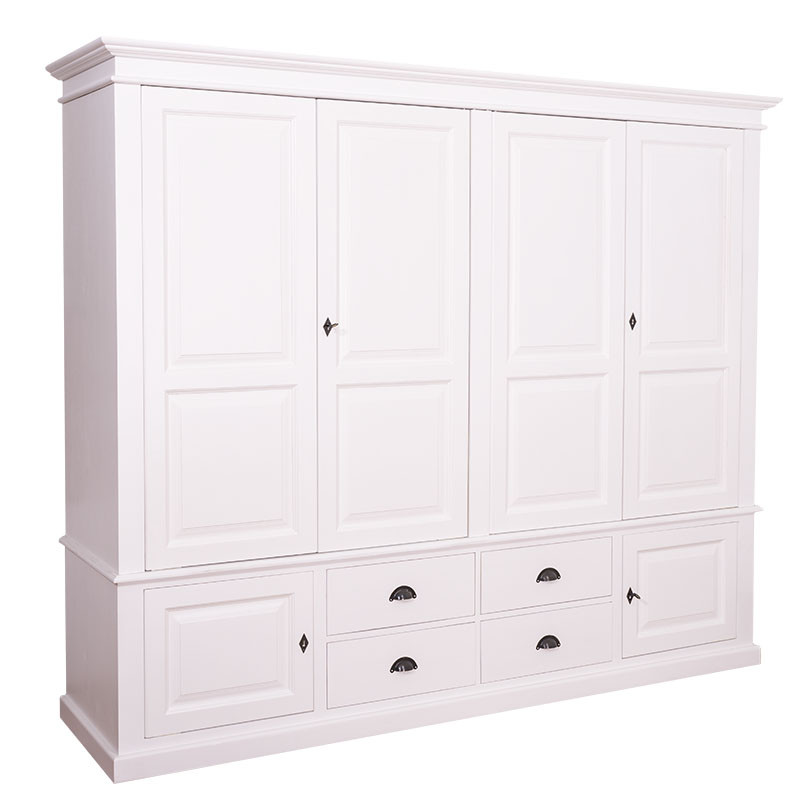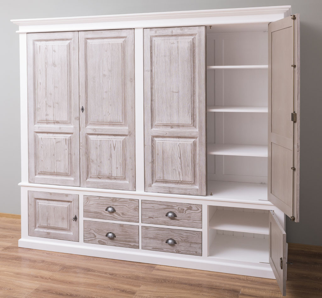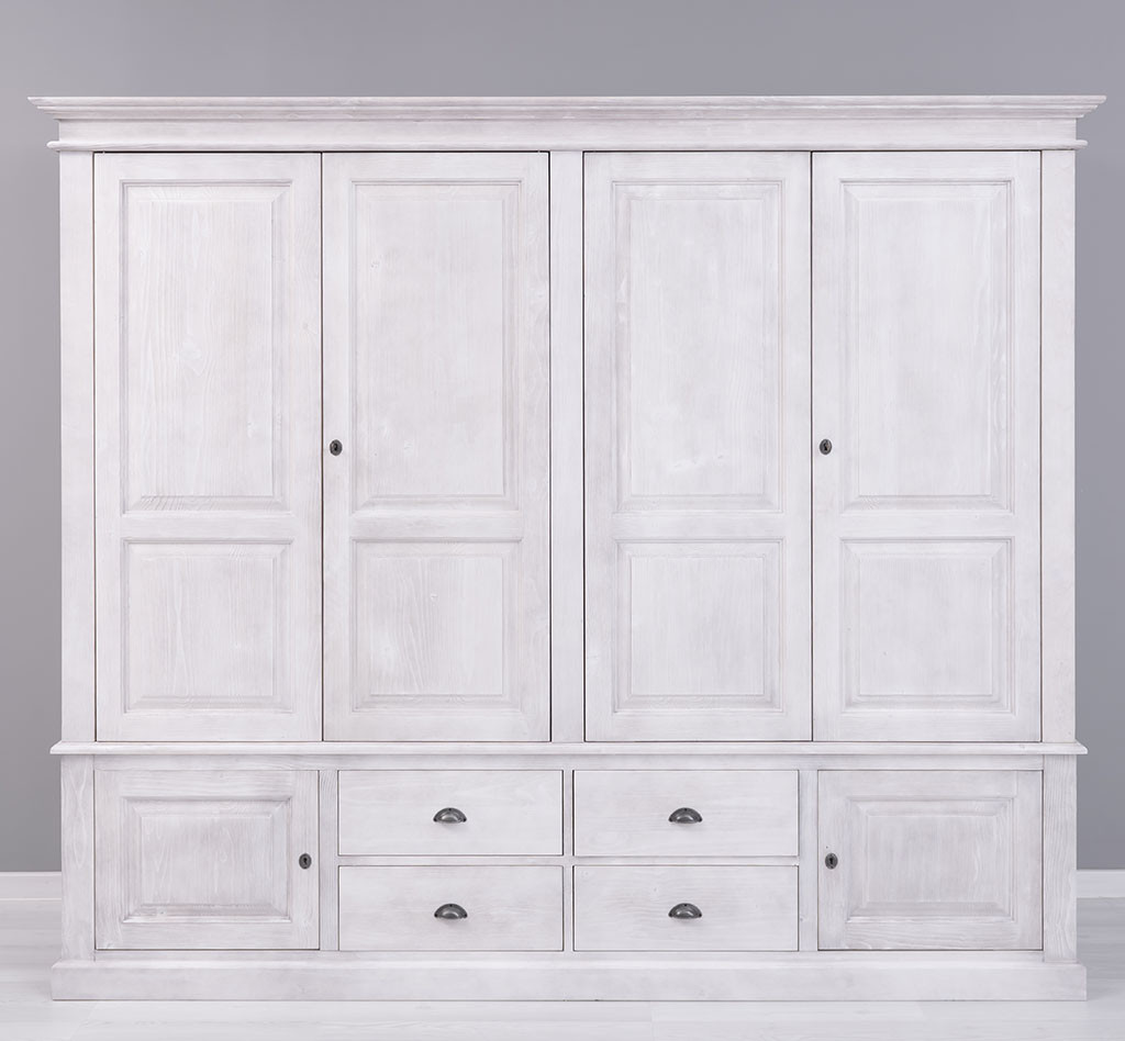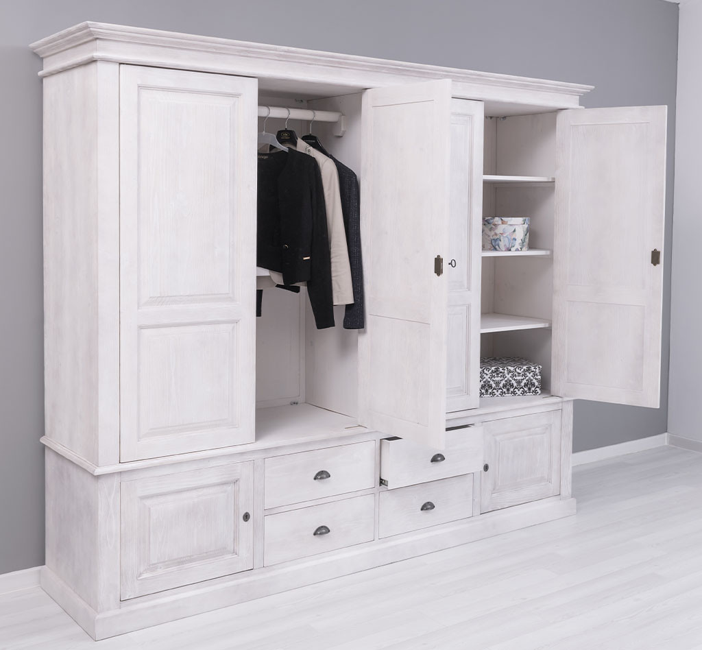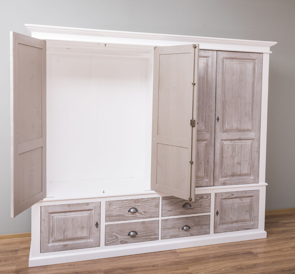 A Magor 4 ajtós szekrény rendkívüli méreteinek köszönhetően rengeteg ruhának lesz hely, miután kitaláltad, hogy hol tudsz neki majdnem 2,5 méter helyet szorítani. A bútor felül 4 zárható ajtós, alatta 4 fiókkal és 2 kisebb ajtóval rendelkezik. A felső részen egyik pár ajtónál akasztós kialakítású, a másik pár ajtónál polcos, 3 db polclappal osztva fel a belsőt. A bútor minden része kivétel nélkül, valódi fából készült. Magor bútorcsaládunk palettája széles, többi termék itt található.