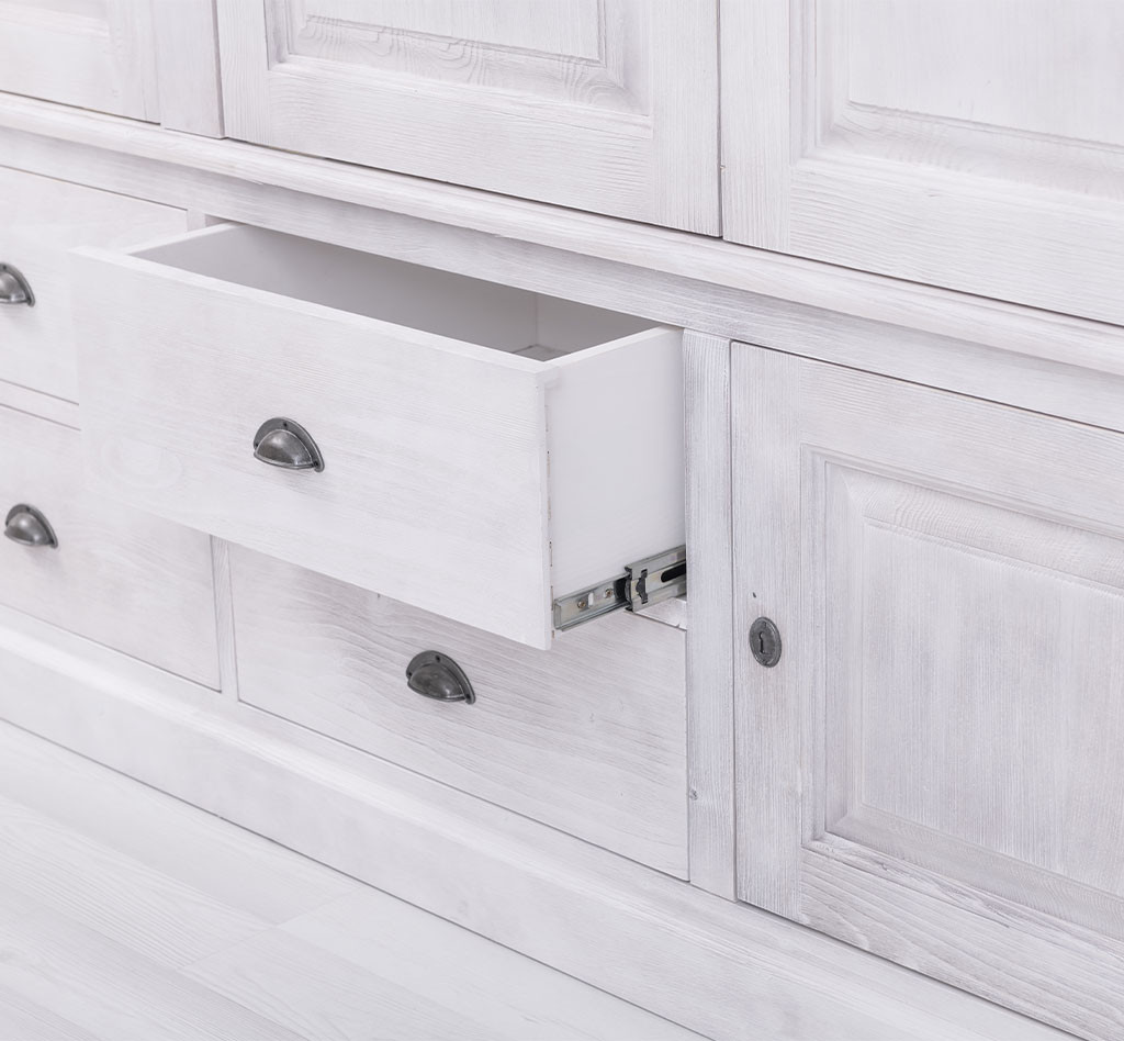 - Hagyományos fa fiókcsúszós vagy nagy terhelhetőségű fém fióksínnel (opcionálisan választható).
